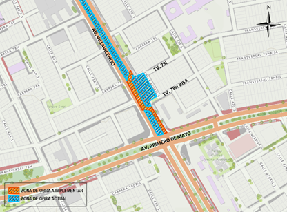 ● Los usuarios que circulen en sentido occidente – oriente por la Av. Villavicencio, continuarán transitando por el carril que quedará habilitado sobre la calzada sur (ver Mapa 2 color morado).