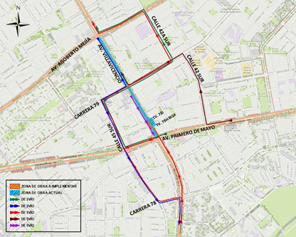 ● Los usuarios que circulen en sentido oriente – occidente por la Av. Primero de Mayo, y desean tomar la Av. Villavicencio al occidente, deberán continuar por la Av. Primero de Mayo al sur – Calle 45 Sur al occidente – Carrera 79 al norte – Calle 42A Sur al occidente – Av. Agoberto Mejía al sur por donde se empalman a su recorrido habitual (ver Mapa 2 color verde).