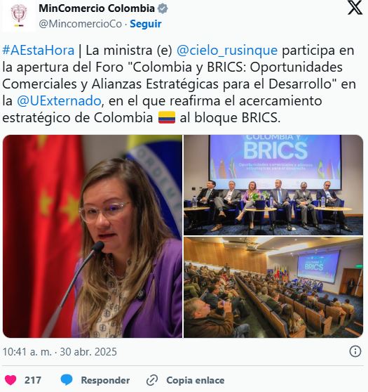 Desde el Gobierno también hubo mensajes directos. La ministra encargada de Comercio, Cielo Rusinque, aseguró que la integración con los BRICS permitiría fortalecer la soberanía económica del país, ampliar mercados y pensar un modelo de desarrollo más acorde con los intereses nacionales.