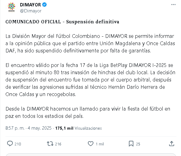 El fútbol colombiano volvió a ser escenario de violencia el domingo 4 de mayo de 2025, cuando el partido entre Unión Magdalena y Once Caldas, correspondiente a la jornada 17 de la Liga BetPlay I-2025, fue suspendido en el minuto 80. Este lamentable suceso ocurrió en el Estadio Sierra Nevada de Santa Marta, cuando un grupo de hinchas locales irrumpió en el campo de juego, provocando una serie de incidentes que empañaron lo que hasta ese momento parecía ser una jornada deportiva normal.