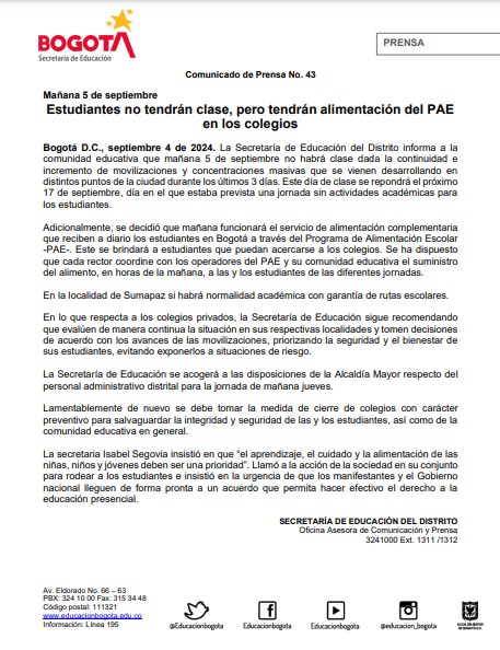 En lo que respecta a los colegios privados, la Secretaría de Educación recomienda que sigan evaluando la situación en las distintas localidades para tomar las decisiones necesarias que permitan resguardar la seguridad y el bienestar de sus estudiantes.
