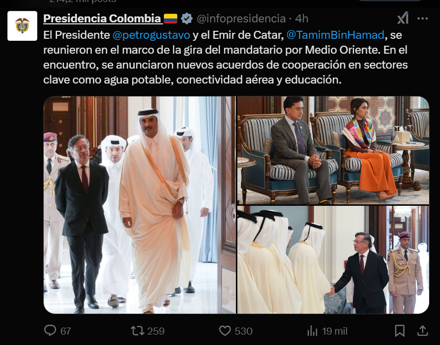 La aerolínea Qatar Airways anunció, en el marco de la gira del presidente Gustavo Petro con el emir de Catar, Tamim Bin Hamad, que, a partir de junio de 2025, inaugurará vuelos directos entre Bogotá y Doha.