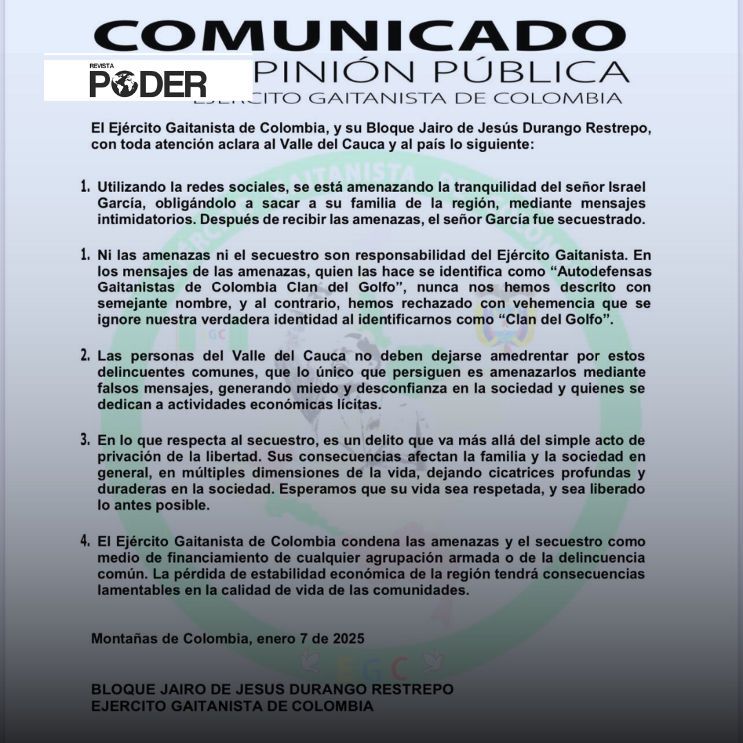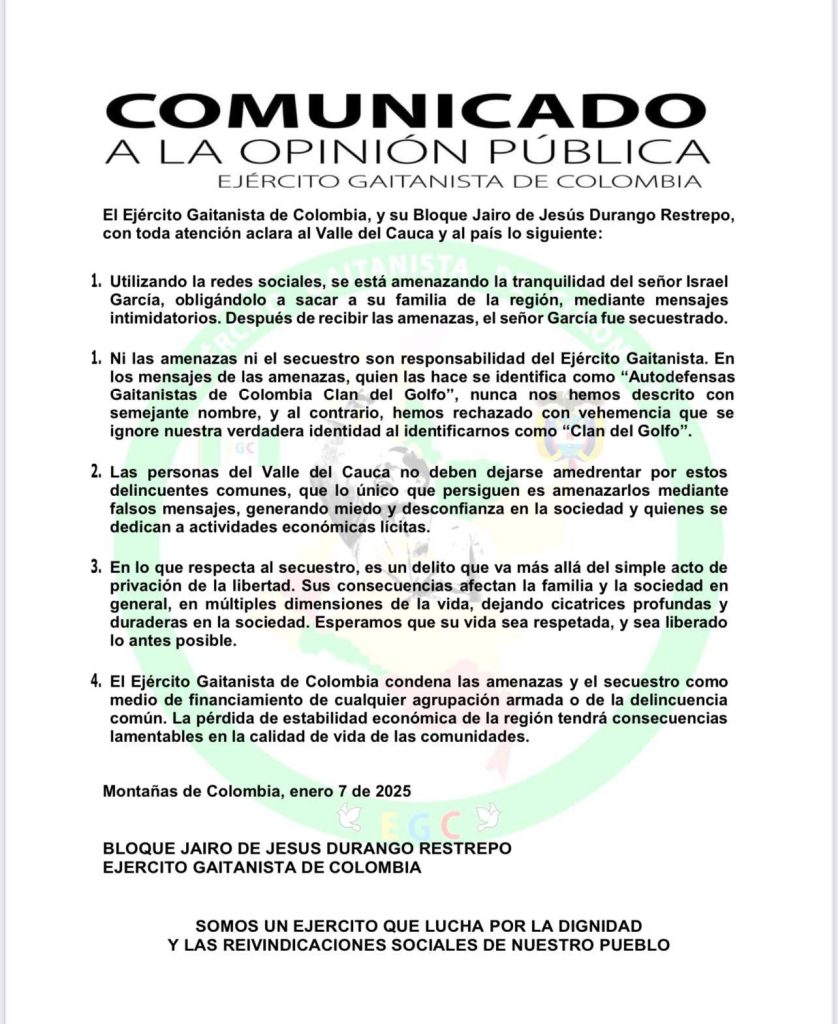El Ejército Gaitanista de Colombia, a través de su Bloque Jairo de Jesús Durango Restrepo, emitió un comunicado aclarando su postura frente a recientes amenazas y el secuestro Israel García, proveedor de caña del Ingenio Providencia en el Valle del Cauca.